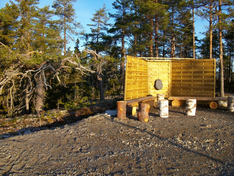 Bild 28A: Grillplats Grytan med grill, bord och sittplatser samt ved med yxa.