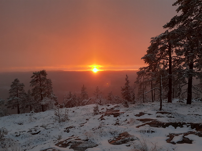 Foto 1: Solnedgång i nyblivit vinterlandskap november 2020.