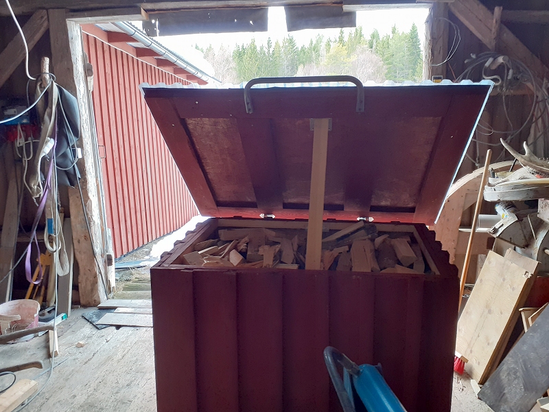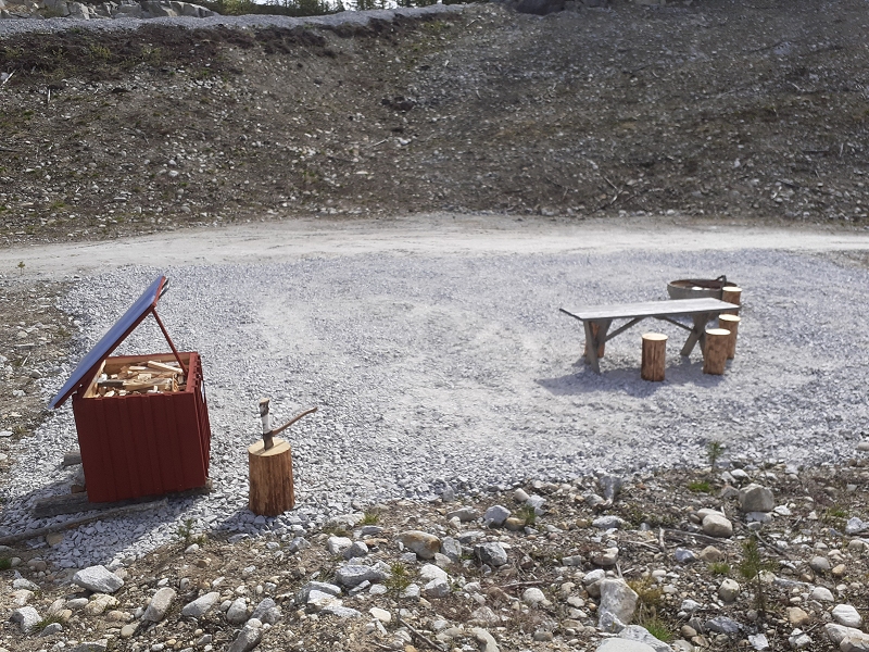 Det finns även en stor vedlår fylld med ved och en yxa tillgänglig för den som hör av sig