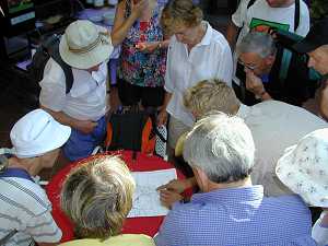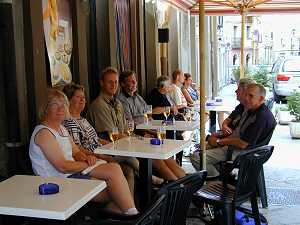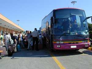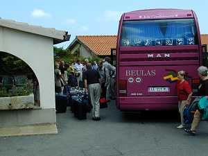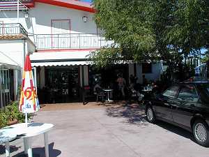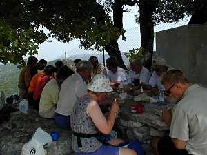 Dag 7: Måndag 4/9 2000 kl. 18:00Nu sitter vi uppe på terrassen och kopplar av medan vi väntar på middagen.I går var vi nere vid stranden och badade fram till 5-tiden på eftermiddagen. Sedan gick vi upp till hotellet och duschade och kopplade sedan av någon timme på terrassen före middagen. Till middag fick vi även denna gång en fiskrätt. Många var inte så nöjda så till i kväll har de flesta valt Entrécote. Vi kan välja mellan olika för-, huvud- och efterrätter. Till efterrätt fick vi em mycket god tårta. Sedan sjöng vi för vår hovmästarinna Christina, som fyllde år denna dag. Efter middagen var det fotboll på TV mellan Italien och Ungern. Några stannade för att se matchen, medan vi andra gick ut på samhället i den ljumma septemberkvällen för att dricka en öl. I morse hade vi frukost strax efter 8.00 på uteserveringen, vilket är en mycket trevlig plats för att äta frukost. Sedan skulle dagens tur arrangeras av hotellets personal, vilket inte började så lyckligt. Med en 20 minuters försening , så kom två minibussar i vilka vi skulle åka. Med nöd och näppe rymdes vi och sedan drog färden igång med snabba ryck. |