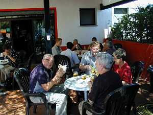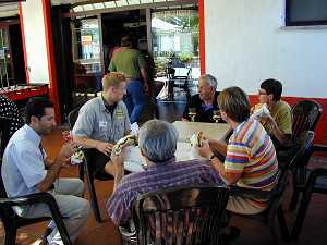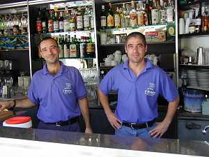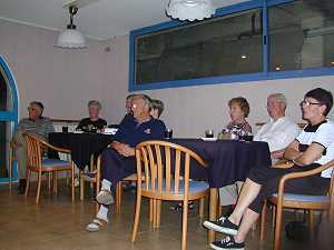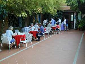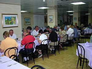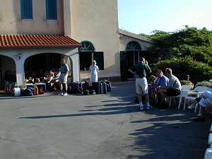 Den lokala befolkningen är mycket trevlig och Sankta Maria ligger fint vid havet med höga berg i bakgrunden. Det vore en fördel att kunna lite italienska, vilket kanske blir till en annan gång. När vi kom ned till stranden, så var de flesta i vår grupp redan där. Vi kunde som vanligt utnyttja hotellets solparasoller och stolar, som finns tillgängliga där för hotellets gäster. Där låg vi några timmar och solade och badade i det varma vattnet. Vi åt glass i restaurangen och hade en pratstund med eras ägare, som fotograferades och ska få komma med på Internet. Kl. 13.00 samlades vi alla vid hotellet för att gå till en restaurang för gemensam lunch. Vi hade tänkt äta pizza, men det visade sig inte vara möjligt att få detta i Sankta maria före 19.00. Det blev i stället pasta och öl. Efter lunchen splittrades gruppen och vi gick till hotellet för att duscha bort saltvattnet. Vi hade alla tillgång till Fredriks rum och kunde duscha där. Nu är det någon timme kvar innan carlos kommer och hämtar oss i sin buss för avfärd till Alghero och flygplatsen. |