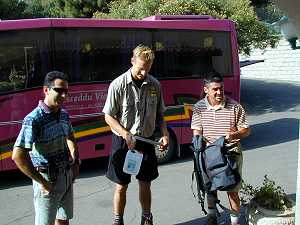 Dag 1: Tisdag 29/8 2000 kl. 22:00Vi finns nu på vårt hotellrum efter att ha ätit middag och presenterat oss för varandra.Strax efter 10.00 var flyget framme vid Sardinien och vi klev ut i värmen. För min del hade jag byxor med avdragbara byxben, så jag kunde kliva av planet i shorts, vilket kändes skönt när det var så varmt. Efter kontroll av pass och hämtning av bagage visade Fredrik på kartan den bussfärd, som stod framför oss. Bussen väntade utanför flygplatsen och vi skall sedan åka med denna buss under hela veckan. Vi åkte först några timmar in på Sardinien innan vi stannade vid en restaurang för lunch. Vi åt för enkelhetens skull alla en stor smörgås och en köttbit och en öl, vilket kostade 7000 lire (35:-). Nu hade det blivit ännu varmare, säkert upp mot 30 grader i skuggan. Värmen kändes som tur var inte i bussen, som hade luftkonditionering. |