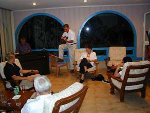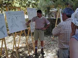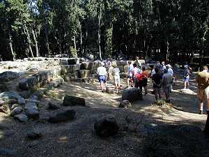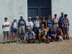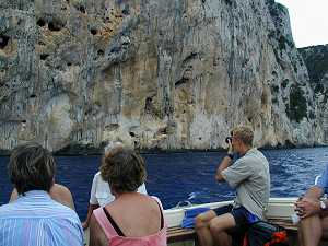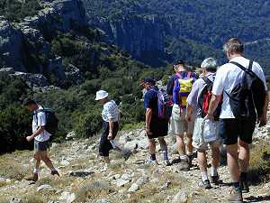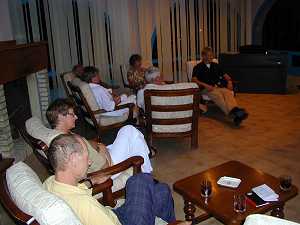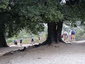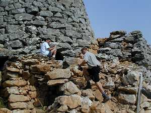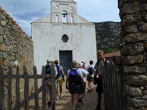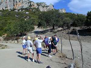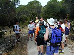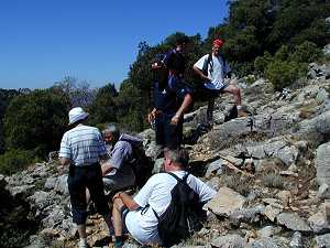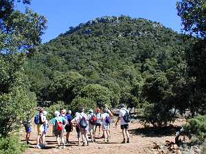 Dag 3: Torsdag 31/8 2000 kl. 18:30Nu sitter vi på verandan och kopplar av med ett glas öl och inväntar middagen kl. 19.30.I går kväll åt vi middag som vanligt 20.00. Denna gång var det t.o.m. fyra rätter, vilket är väl mycket att klara av så sent på kvällen. För min del måste jag tyvärr lämna av en del rätter för att orka med. Det visar sig finnas flera musikaliska talanger i sällskapet, så vi hade en frågestund om musik och gemensam sång under slutet av middagen. Efteråt gick vi till den nedre våningen, där Stellan underhöll oss med sång och spel på orgel. Det var mycket uppskattat att ha en underhållare i sällskapet. I morse var det frukost redan kl. 7.00, då vi skulle åka iväg med bussen 8.00. Vi fick med oss lunchpåsar och vatten. Vi skulle dessutom ha med extra tröjor, då vi skulle vandra i en lång grotta. Sedan körde Carlos oss c:a 45 min. till vårt startläge. Vandringen inleddes denna gång med en rätt lång och brant stig, som kändes för en del. Efter 2 timmar var vi framme vid Nuraghe Serbissi, där vi tittade på gamla boningar byggda av sten. |