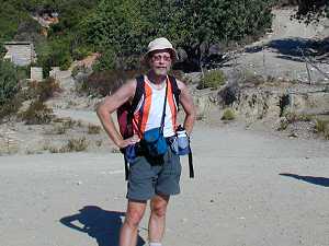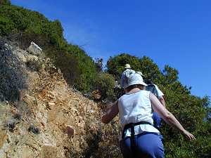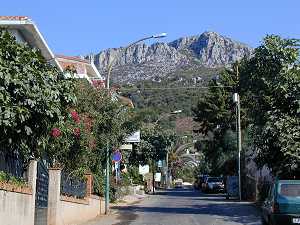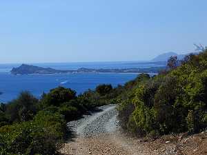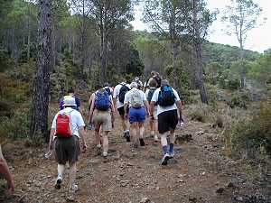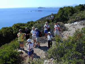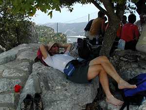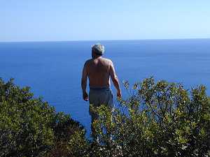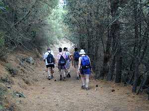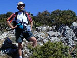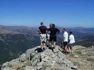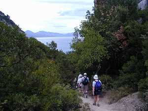Dag 6: Söndag 3/9 2000 kl. 15:00Nu ligger vi som vanligt nere vid badstranden och solar och badar i det varma vädret.I går eftermiddag gick Fredrik och jag ut för att motionera lite och rekognosera dagens vandring. Det var runt 30 grader så jag hade enbart linne och shorts samt bälte och vatten. Det visade sig inte vara så enkelt att hitta användbara stigar, då det inte tycks vara vanligt för den lokala befolkningen att vandra. Dessutom blir det svårt, när vi inte kan italienska och dom kan inte engelska. Vi hade en halvbra karta att följa och tog en gata österut utefter kusten. Vid dess slut fanns en restaurang. Sedan var det slut på bebyggelse och vägar. Det gick dock en stig utefter ön c:a 100 meter från vattnet. Vi följde denna stig någon km. detta var en lättgången stig för vandring och den tycktes fortsätta långt bort. Men vi kom aldrig uppåt mot bergen med denna stig, så vi vände om. När vi kom tillbaka in mot samhället, såg vi en mindre grusväg, som gick uppåt eventuellt bara till husen ovanför. Vi följde denna väg och den gick brant uppför c:a 1 km. och 250 meter i höjdled. Det tog på bra, då vi hade högt tempo. Sedan fortsatte vi förbi en grind och vägen gick på ungefär samma höjd med en fantastisk utsikt mot havet och bergen utefter ön. Här hade vi hittat den rätta vandringsleden fast med en tuff början. |