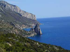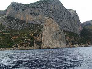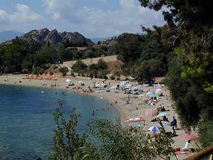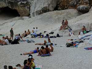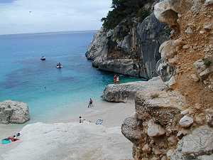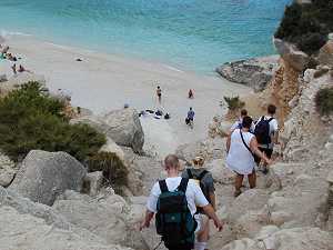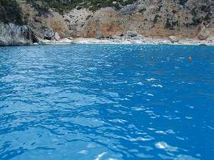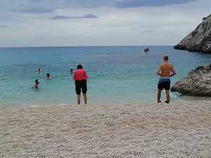 Utsikten ned mot havet var magnifik och längst ner fanns en lagun med en strand. Sista biten var en klättring på 10-15 meter. Där nere lade vi oss tillrätta för några timmar med bad och vila. Vattnet var turkosblått och mycket skönt att bada i. Stranden bestod av små runda stenar, så det var en fördel att ha badskor på sig. Det var också många andra turister där, som måste gå den jobbiga stigen tillbaka. |