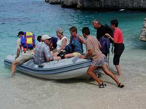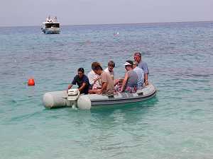 till båten med en mindre gummibåt. Därute passade flera av oss