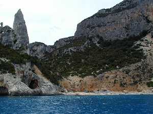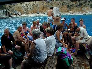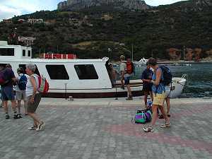 Dag 5: Lördag 2/9 2000 kl. 14:30Vi sitter nu och slöar vid badstranden i Sankta Maria Navarese.I morse var vi igång strax efter 7.00 för att packa ner allt i våra väskor. Vi hade fortfarande kvar 4 liter vatten, så det blev fullt i både ryggsäckar och väska. Kl. 9.00 tog vi farväl av hotellet och dess personal och åkte med Carlos i väg ner mot kusten. Det fanns ett flertal olika sandstränder och efter en knapp timme kom vi fram till Tortoli. Där fick vi en dryg timme på oss att se oss omkring och shoppa. Då var det 28 grader i skuggan, så vi passade på att äta glass. Vi köpte även Sardinisk keramik samt en flaska av vardera ett lokalt rött och vitt vin. |