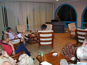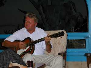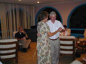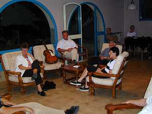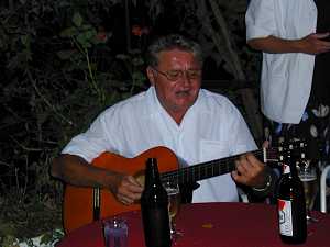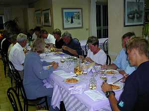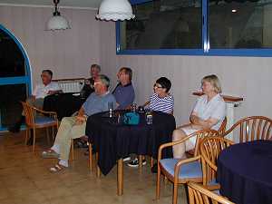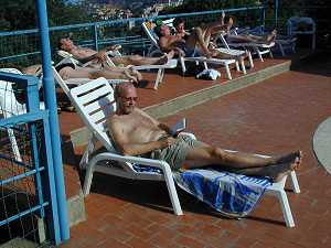 Dag 8: Tisdag 5/9 2000 kl. 15:30Nu sitter vi i fåtöljerna i receptionen i vårt hotell och dricker en kopp kaffe.Till middagen i går hade de flesta valt Entrécote i stället för fisk, som vi fått de två dagarna före. Den smakade bra, men serverades utan något till. Man har således inte t.ex. potatis eller ris i huvudrätten. Däremot fanns potatis i salladsbordet för den, som ville ha detta. Sedan hade Fredrik sett till så att det fanns en gitarr. Så nu kunde Göran åter bjuda på en sång- och gitarrkväll. Vi satt till över 23.00 på uteplatsen och fick lyssna till mycket Elvis Presley och hans liv samt om Evert Taube och Ove Thörnqvist. Vi hade som vanligt en mysig stund tillsammans. I morse hade vi frukost 8.30 på uteplatsen. Det var nu åter helt klart väder. Vi skulle få ha våra rum till 12.00 och Fredrik hade sitt till 17.00, då vi ska åka. Vi kunde få ha våra väskor inne i Fredriks rum under dagen. Några gick sedan direkt ner till stranden för att sola och bada medan vi beslöt att packa våra väskor och bära in dessa till Fredrik. Därefter gjorde vi en promenad genom den övre delen av samhället och sedan ner mot havet. |