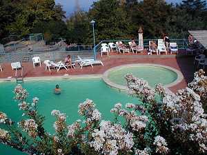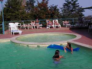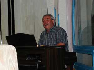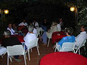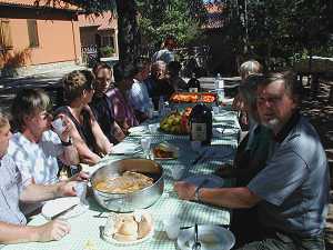 Vi fortsatte sedan utför en bred väg samtidigt som vi pratade gamla svenska idrottsminnen. Vi var då på mycket gott humör efter toppbestigningen, så denna vandring till vår lunch gick tämligen fort. Vi kom c:a 14.00 tillbaka till vårt lunchställe och träffade de andra, som inte hade gjort toppbestigningen. Här fanns ett långt träbord under stora träd, så vi fick sitta i skuggan. En halvtimme senare kom Carlos med sin buss lastad med en dignande lunch. Den bestod av ost, korv, oliver och bröd till förrätt samt Lasagne och kött till huvudrätt. Till detta presenterade Francesco tre olika lokala vinsorter, som vi fick avsmaka. Det var en mycket populär lunch, som vi fick tillsammans. Hela gruppen började nu känna varandra och stämningen kändes angenäm. Vi samlade ihop pengar till Francesco, för att visa att vi var mycket nöjda med hans guidning och service till oss. Så småningom var det dock dags för avfärd. Det visade sig vara en lång bussresa, där vi var tvungna att åka runt hela bergsområdet. Vi mötte då på vägen alla möjliga husdjur som kor, hästar, grisar, åsnor, får och getter, allt utom höns. Man tycks låta husdjuren vandra fritt. Vi kom därför inte tillbaka till hotellet förrän 18.30. Det hann inte bli något dopp i poolen, utan kvällen fortsatte med middag 19.30. Vid middagen tar vi upp två bord men runt 20.00 kommer även de andra gästerna, vilka till övervägande del är äldre italienare. Efter middagen gick vi till sällskapsrummet, där vi nu sitter. Här får vi underhållning av Stellan på piano och Göran med gitarr och till detta olika sånger. Dessa kvällsstunder med sång och musik är trevliga och gör att stämningen höjs ännu mer i gruppen. |