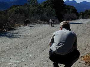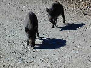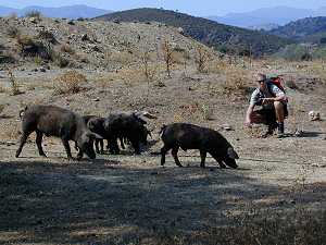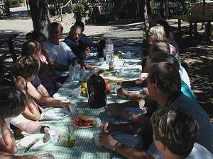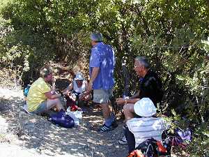 Vi åkte med bussen till Seléne Forest, som är en park. Detta låg en bit upp i bergen och på vägen dit såg vi även områden, som hade brunnit. P.g.a. torkan har man problem med bränder. Vi besökte Giant's Tombs, som är gamla gravar från 1500 f.kr. Sedan vandrade vi från 11.00 uppför Mount Armidda. Det var nu c:a 27 grader i skuggan, men vandringen var långsam så det gick bra för alla. Vi gick för det mesta på grusvägar och efter 2 timmar stannade vi för lunch. Det fläktade något, vilket var skönt i värmen. Det var svårt att orka med all mat, som fanns i lunchpaketet vilket innehöll så mycket. Till detta drack vi vatten och kaffe/te. Här var vi c:a 1000 m.ö.h. Sedan bar det av utför och så småningom kom vi fram till Villa Grande railway station, som låg 800 m.ö.h. Medan vi väntade på Carlos blev vi goda vänner med ett antal grisar, som fick mat av oss. Sedan blev vi upphämtade av Carlos och var tillbaka till hotellet 16.00. Nu tar alla det lugnt och en del av oss tar ett bad i poolen. |