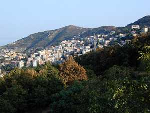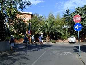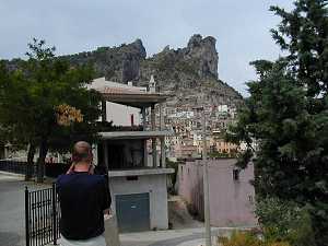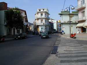 Så småningom var det svårt att komma längre. Utsikten mot öster var magnifik med bergen, som såg ut som Dolomiterna. Nere vid vattnet c:a en km. bort stack en stor brant klippa rakt upp 100 meter. Vi gick tillbaka en bit och sedan vek vi av neråt mot den nedre stigen. Det var c:a 250 meter i höjdled och besvärligt och snårigt, så jag rev upp en del sår på benen. Efter en kvart var vi dock nere vid den nedre stigen och sedan småsprang vi tillbaka. På två timmar och en kvart hade vi hunnit rekognosera en hel del för vandringar nästa dag. Jag hade svårt efteråt att få ned kroppstemperaturen, då jag duschade för fort och fick sitta en bra stund efteråt med en kall öl och bar överkropp för att svettas färdigt. Jag hittade även några andra uppe på terrassen, där vi hade en trevlig pratstund. Därefter var det dags för middag kl. 19.30. Till huvudrätt fick vi denna gång en fiskrätt i stället för kött, som vi ätit på hotell Villa Selene. Det var dock ingen populär rätt, så många lämnade denna. Vi försökte avsluta kvällen med musik, men hittade inget ställe där Göran kunde få låna en gitarr. Vi gick runt i samhället kl. 22.30 i 27 graders värme. Nu tycktes alla vara ute med öppna affärer en lördagkväll och även småbarnen var ute och lekte. Vi gick runt på gatorna och stannade sedan vid en restaurang och drack en öl innan det var dags att sova. |