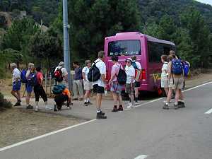 Dag 2: Onsdag 30/8 2000 kl. 16:30Nu ligger vi några i swimmingpoolen och solar oss. Jag har även hunnit med att ta ett bad i det varma vattnet.I morse hade vi ställt klockan på väckning 08.00. Kl. 08.30 åt vi alla frukost. Där fanns bl.a. möjlighet att blanda choklad och mjölk till varmchoklad, för dom som så önskar detta. Annars fanns väl det mesta, som man vill ha till frukost. Vi kunde även lämna in vår termos och få den fylld med hett vatten. Efter frukost gjorde vi i ordning för vår första vandring. Det viktigaste var att smörja in sig med sololja med solfaktor 15 eller mer. Dessutom skulle man ha vandringsskor och solhatt, som skydd mot solen. Lite ombyte av kläder var också med. Jag hade dessutom bälte med flaska med vatten, vilket är bekvämt då det alltid finns nära under vandringen. Från hotellet fick vi dessutom en lunchpåse, som visade sig innehålla väldigt mycket mat samt vatten. Allt lade vi ner i våra ryggsäckar. Kl. 10.00 kom vår busschaufför Carlos och hämtade upp oss. Dessutom hade vi en egen guide Francesco, som skulle leda oss runt på våra vandringar. |
