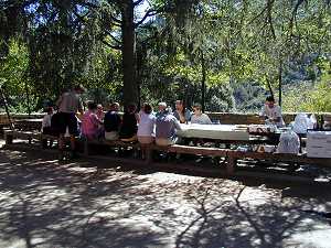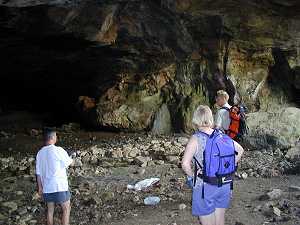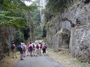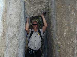Det fanns ett långt stenbord under ett träd, där vi kunde äta från våra lunchpåsar bl.a. sallader med potatis, tonfisk m.m. och bröd. Vi hade även hett vatten och kunde dricka te/kaffe, vilket smakade bra trots värmen. Efter lunch gick vi en timme utför en väg innan vi mötte Carlos med bussen. Han körde oss vidare till grottorna Su Marmuri. Här var vi något tidiga, då det visade sig att vår grupp hade vandrat snabbare än tidigare grupper. Sedan var det dags att göra entré i den långa grottan. Det visade sig vara en mycket imponerande grottgång på c:a 1 km och upp till 50 meter i höjd. Där finns en stor mängd stalaktiter och fladdermössen bodde här framför allt vintertid. Ute i luften var det c:a 30 grader medan nere i grottgången var det enbart 10 grader. Därför måste vi ha extra kläder att ta på. Efter detta intressanta besök åkte vi buss tillbaka och var vid hotellet 17.30. Reseledaren Fredrik och jag passade på att ta ett dopp i poolen för att svalka av kroppen och nu är det snart åter middag. |