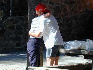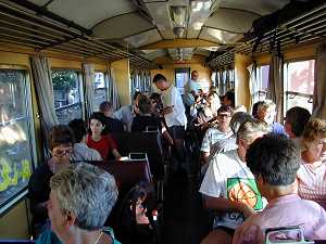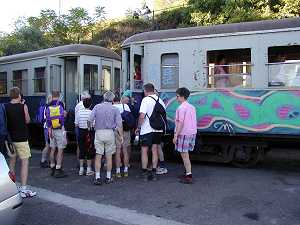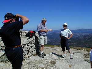 Dag 4: Fredag 1/9 2000 kl. 21:30Vi är nu i sällskapsrummet. I går kväll fick vi efter middagen åter njuta av en av deltagarnas musikaliska talanger. Det var Göran, som spelade gitarr och sjöng både Evert Taube och Cornelius visor. Vi fick även ta del av Taubes liv och skrivande.I morse hade vi åter frukost kl. 07.00, då vi skulle åka strax efter 08.00. Som vanligt måste man smörja in sig ordentligt med sololja. Vädret var nu klarare mot tidigare, då det varit mera soldis. Solen skulle antagligen kännas ordentligt idag. Vi åkte med Carlos ned till järnvägsstationen i Lanusei. Därifrån åkte vi med ett turisttåg c:a en timme. Vi fick nu se ett nytt landskap från vagnsfönstren, då tåget först åkte söderut innan det vek av in i landet. Vi klev sedan av i Forest av Mantarbu. Därifrån gick vi en dryg halvtimme innan vi kom till vår plats , där vi skulle äta lunch. Därifrån gick vi vidare genom en hög och grön skog, som skyddade oss från solens strålar. Vid 11.30 var vi framme vid en plats där vi skulle dela upp oss i två grupper. Dom som ville, skulle göra en toppbestigning medan övriga gick via en bred väg under c:a en timme tillbaka till vår lunchplats. Vi var sex stycken samt guiden Francesco, som gjorde toppbestigningen. Det var en delvis något brant stig men egentligen ej besvärlig. Vi höll dock ett något för högt tempo, så det blev jobbigt för en del. Det visade sig också att vår bestigning tog enbart 45 minuter mot beräknade 1,5 timmar. Däruppe var det en fantastisk utsikt åt alla håll. Där fanns som på så många andra toppar ett observatorium, där man vakar framför allt över eventuella skogsbränder. |