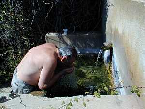Vi fick ett lunchpaket, som var något mindre än tidigare. Den innehöll bara en halv liter vatten, vilket är för lite för en dagsvandring i 30 grader. Vi gick därför några till en affär i närheten och köpte extra vatten. Jag tog med 2 liter vatten för mig samt termos med hett vatten. Sedan skulle kroppen smörjas in som vanligt med sololja. |