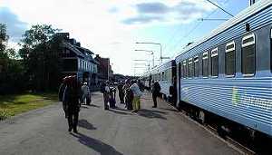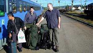 Pirrandet i magen blev märkbart mera då vi klev på tåget. Det var ju spännande, men samtidigt var jag lite orolig för att inte orka med vandringen. Visste ju inte hur kroppen skulle reagera på att vandra i en veckas tid. Natten på tåget var lite jobbig. Tåget krängde så mycket att jag ständigt fick ligga på helspänn och parera så jag inte skulle ramla ur den smala sängen. Mellan varven kändes det som om jag skulle åka rakt ut genom fönstret. Då morgonen kom låg jag dock kvar i bingen. Resan var lång, och jag som rökare fick lite problem på mogonkvisten av att inte kunna ta en rök till kaffet. Inte blev det bättre när Staffan vaknade och inte hittade sina glasögon. Panik utbröt innan han äntligen hittade dom mellan väggen och sängen. |