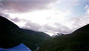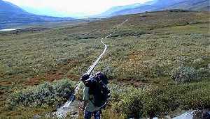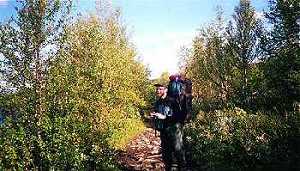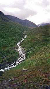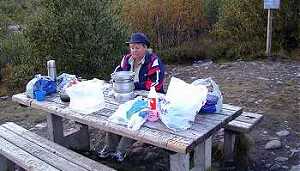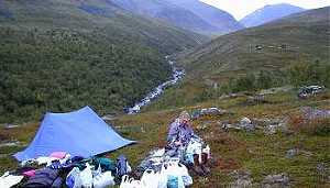 Dag 5: Måndag 27/8 2001Där fanns en stuga vi kunde hyra och laga mat och torka kläderna. Hade lite blöta kläder efter en liten malör dagen innan. Nu fick vi allt torrt, och kunde laga mat på gasolkök. Den kvällen fick jag feber. Tror det berodde på all ansträngning jag utsatt min kropp för i fyra dagar.Nu började jag känna mig riktigt stolt över mig själv, att jag klarat av det så här långt. Hade ju mina tvivel dom första dagarna. Värken började släppa riktigt nu, och jag kände mig glad. För första gången sedan vandringen började. Nu kunde jag njuta av vandringen tillbaka. Kunde se det jag inte sett förut då jag bara haft ont. |