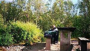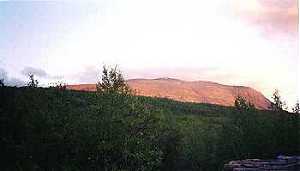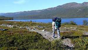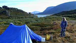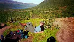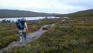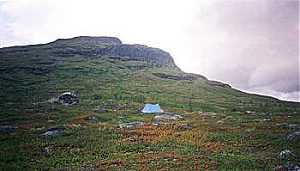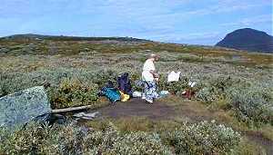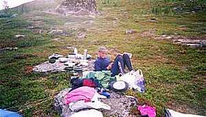 Dag 4: Söndag 26/8 2001 kl. 21:00Jag sov ganska bra den här natten på ön. Bättre än jag sovit nätterna innan. Det kändes skönt. Vaknade ju som vanligt tidigt på morgonen. Staffan sov. Jag tog mitt kaffe och satte mig på en sten och njöt av morgonens uppvaknande. Passade på att ta några kort.Då vi ätit frukost och gjort klart allt, började så vår vandring tillbaka. Först båten över sjön igen. Så den där vandringen som dagen innan varit nerför. Nu var den uppför, men det kändes inte lika jobbigt nu. Plankorna gjorde det lättare att ta sig uppför. Vi vandrade tills vi kom fram till samma lägerplats som vi haft på vägen till Alesjaure. |