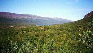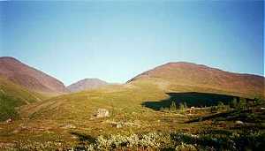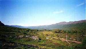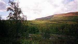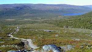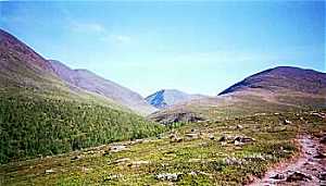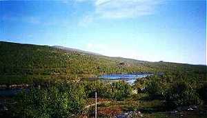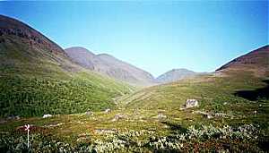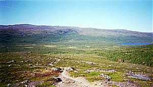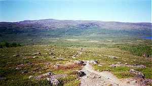 Dag 1: Torsdag 23/8 2001Så började då vår vandring. Självklart var det uppför nästan direkt. Hade känt mig lite orolig för det innan resan. Uppför är inte så där kul för mig. Ovan som jag är, otränad, och tungt på ryggen. Det bådade inte gott. Jag hade tagit min Astmamedicin innan vi startade, och tur var det. Innan vi var uppe i första backen var jag helt slut. Trodde jag skulle svimma av trötthet efter 5 kilometer. Hela kroppen skrek efter vila. Vi kom till ett jättefint ställe efter 5 kilometer. Här stannade vi och fikade. Vädret var fortfarande underbart, och jag hade turen och hittade ett torrdass. Lycklig blev jag för det. Efter fikat hade jag hämtat mig så mycket att vi bestämde oss för att fortsätta lite till. |