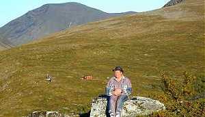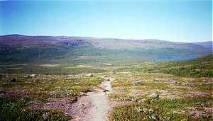 Där visste vi ju hur det var. Vi åt en härlig köttgryta med potatismos. Innan vi åkte på resan hade jag torkat kött att ta med. Det var allra bäst matmässigt. Lätt att bära och väldigt gott blev det. Precis då vi var klara för kvällen började det dugga. Det var första regnet sedan första dagen då vi klev av tåget i Abisko. Det blev inte så mycket av regnet. Dessutom var vi varma och torra i tältet. På morgonen hade regnet upphört, och det blev varmt igen. Så startade vi vandringen igen. Den här dan kände jag inte alls lika mycket av värken som dagarna innan. Däremot tyckte jag att marken kommit närmare näsan. Tyckte att jag krymt flera centimeter av tyngden på ryggen. Benen gick som trumpinnar, och vid ett-tiden på dan var vi framme i Abiskojaure. |