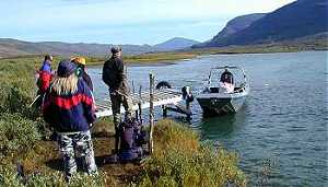 I god tid hann vi så fram till båtlägret. Mina fötter hade svullnat upp, och kändes som klubbor då jag gick. Det var en hemsk smärta. Vi satt där och väntade på båten en timme. När den så kom, och vi skulle kliva ombord gjorde mina fötter så ont att jag nästan inte kunde gå. Resan över var helt otroligt häftig. Vädret var toppen, jag fick sitta, och det blev fullt med folk i båten. Färden över sjön tog 20 minuter. Det gjorde underverk med mina fötter. Svullnaden lade sig så det kändes inte lika ont då vi gick iland på Alesjaure. Nu letade vi upp en helt öppen plats lite nedanför själva fjällstationen. Vi ville ju ha det lite för oss själva. |