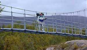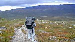 Avresa: Onsdag 22/8 2001Min allra första vandringHej!Nu ska jag försöka skildra min första vandring i fjällen. Resan gick till Abisko den 22 August 2001. Har nog aldrig varit så nervös i hela mitt liv, som den dagen då resan startade. Vi, min sambo Staffan och jag, Jane, tog tåget till Abisko. Avresan startade 19.20 på onsdagskvällen. Vi skulle sova ombord på tåget. Packningen jag hade vägde 16-17 kilo. Det var tungt kan jag säga. Jag har aldrig vandrat förut, och aldrig gått någon längre sträcka med tung ryggsäck heller. Så det var ju inte någon hit när jag kände tyngden på ryggen. Fast då i början var det ju inte så farligt . Jag kände ju att det var tungt, men axlarna och ryggen kändes bra. |