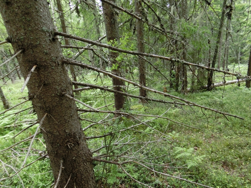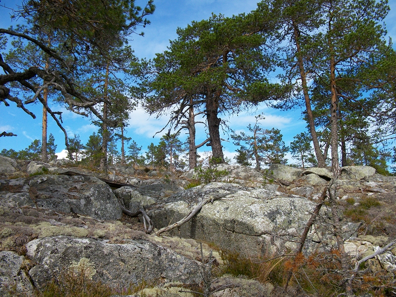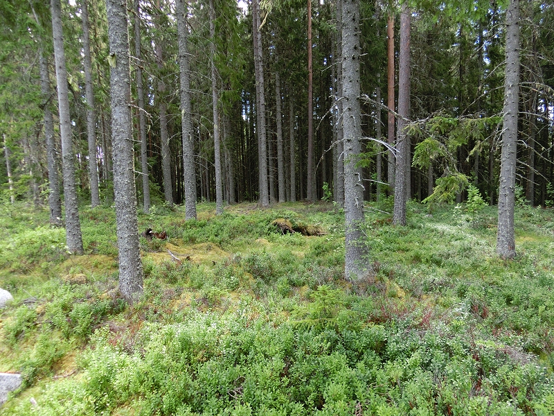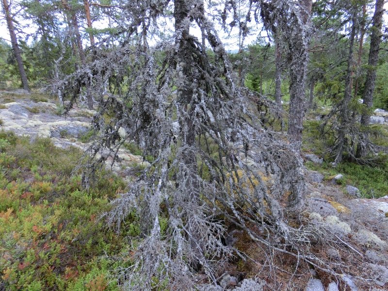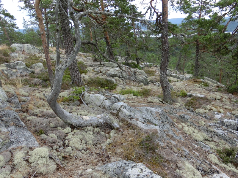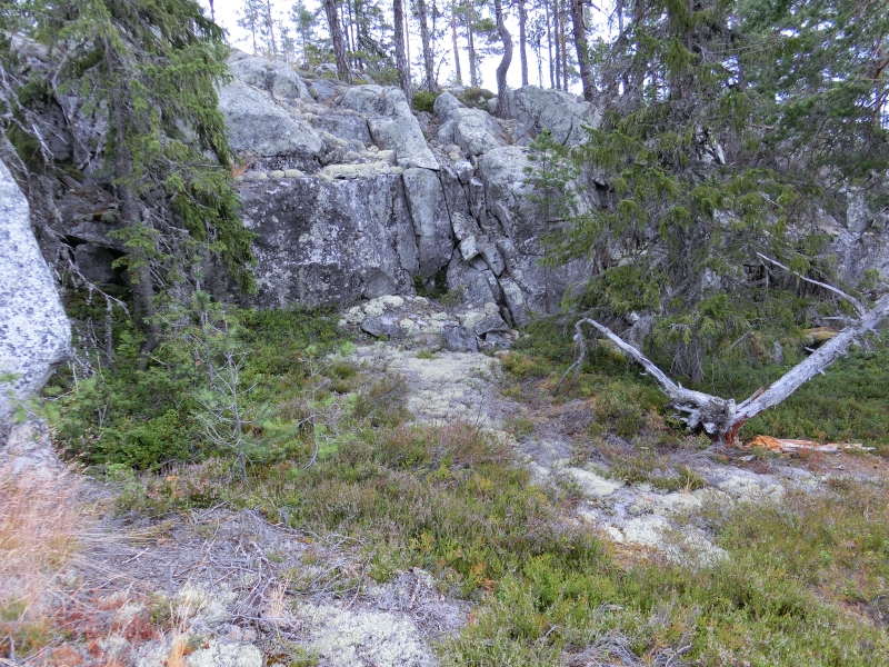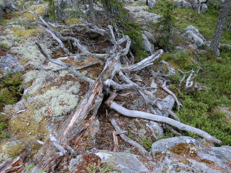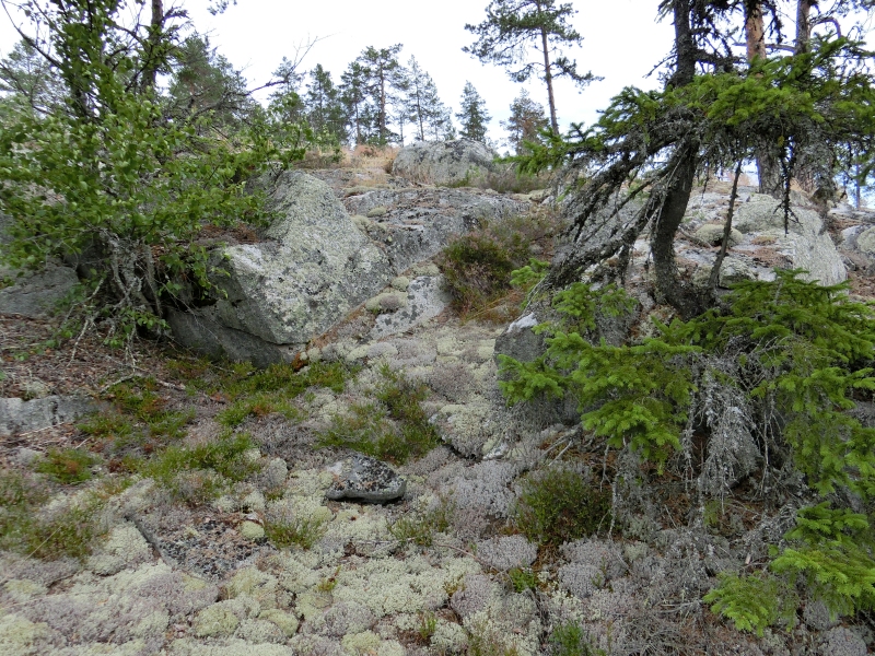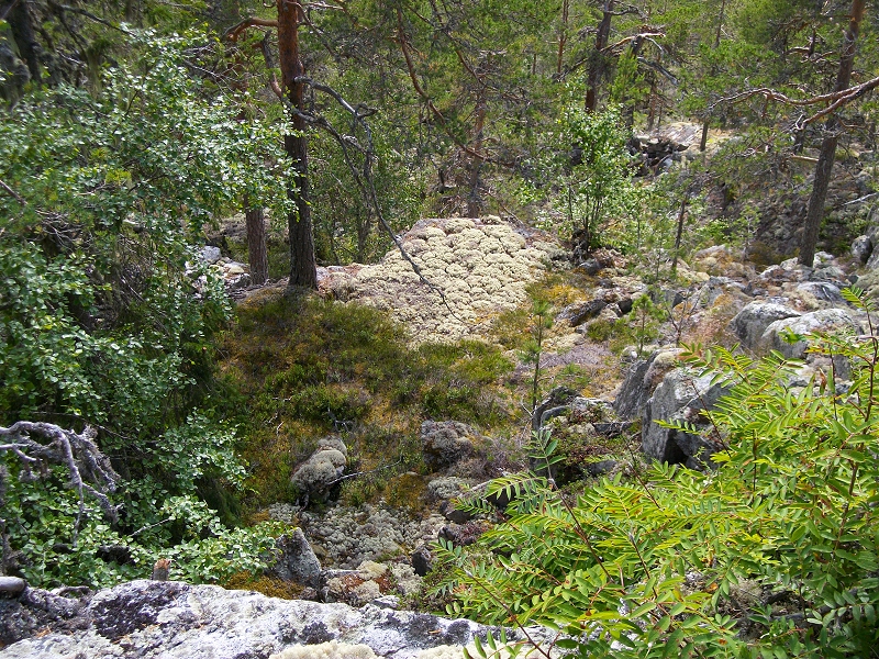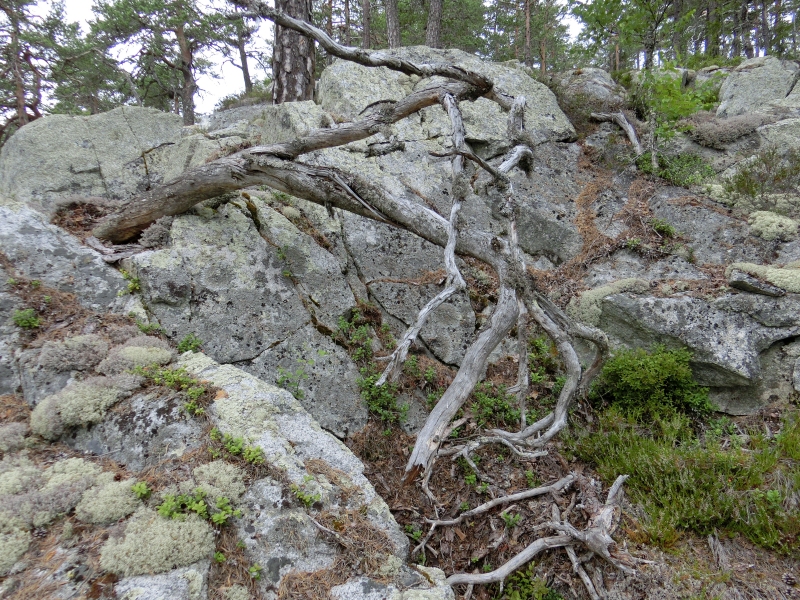 Här finns spillror av träd, vegetation och stenar med mossa av olika storlek.