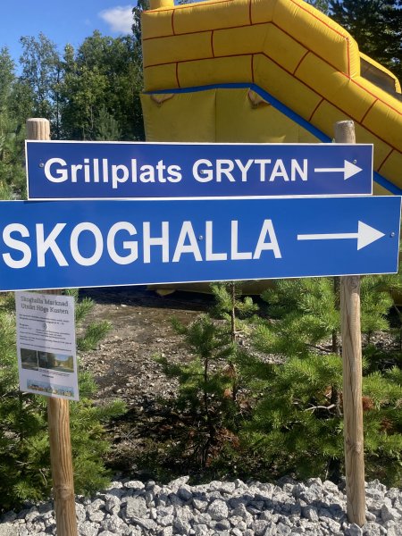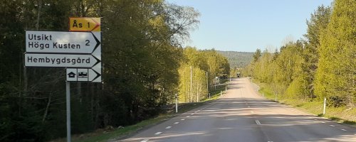 Vägskylt till Utsikt Höga Kusten med Skoghalla sommarmarknad.