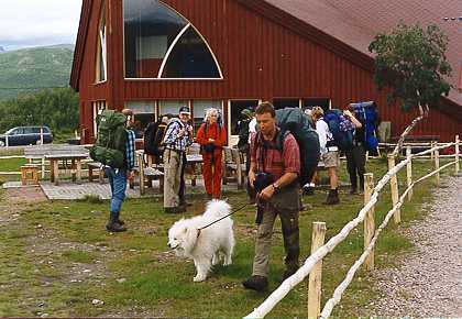 Dag 6: Torsdag 6/8 1998 kl. 19:30Nu sitter vi i flygplanet i Kiruna och väntar på avfärd.I går blev det nog rekord med antal övernattningar på stationen. Regnet vräkta ned på kvällen och många som tältade kom för att få tak över huvudet inomhus. Man lade då ut madrasser i diverse utrymmen och t.o.m. i bastun. I morse var vi uppe tidigt för att packa och städa och komma iväg vid 9.00 mot Nikkaluokta. Vädret var lika dåligt med tät dimma och regn som kvällen före. Trots detta gav sig gänget för topptur iväg 8.30 för att bestiga Kebnekaise, men en halvtimme senare kom de tillbaka, då det regnade för mycket. Vi kom iväg strax efter 9.00. En i sällskapet hade dock för ont i knäet, så han skulle åka med en av helikopterturerna tillbaka till Nikkaluokta. Denna tur kostade 390:-. Under vår vandring mot Ladtjojaure blev vädret bättre med sol och högre temperatur. Vi kom fram till sjön efter knappt 3 timmars vandring. Det kom hela tiden många vandrare, som ville med båten 12.30. Som tur var hade man tagit den stora båten som rymde många vandrare. |