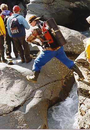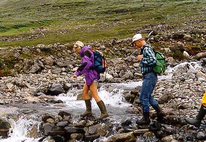 Dag 2: Söndag 2/8 1998 kl. 09:15Nu är vi snart färdiga för att gå ut på en tur utefter dalen mot Silverfallet. I dag verkar vädret vara bättre än i går. Det är 11°C och molnen ligger lågt men solen håller på och torkar upp och skiner igenom ibland.Jag glömde tidigare att skriva att jag i går morse före avresan tejpade fötterna med 5 cm bred luktaplast både horisontellt och vertikalt uppifrån och under hälen på båda fötterna. Då är risken liten för skavsår. |