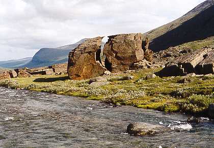 | När vi vandrade ner mot Ladtjovagge blev vädret ännu bättre och solen sken hela tiden. Det var dock en frisk nordvästlig vind, vilken uppe på topparna var så hård att dagens toppbestigning hade avbrutits. Vinden medförde att det var helt myggfritt. | Vi tog oss över Ladtjojokk vid klipporna där det var smalt och följde jokken ner till Elsas bro och gick därifrån tillbaka till fjällstationen. |