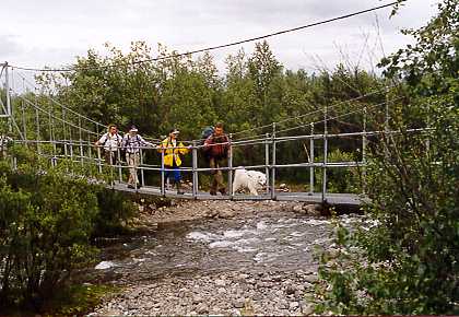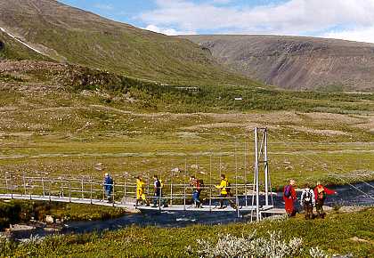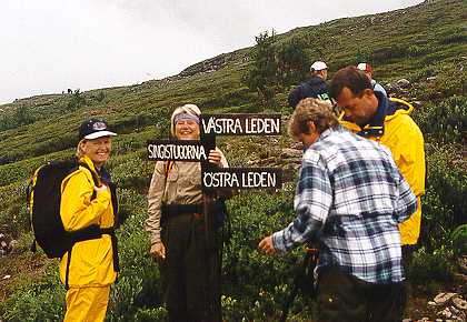 Flera i gruppen har nu fått ont i knäna av vandringarna och tre st. följde ej med, utan skulle spara sig för att klara av de 13 km som vi skall vandra i morgon mot Nikkaluokta. Ingen har faktiskt fått skavsår, vilket kan vara vanligt (se min vandring 1992 Kebnekaise - Vakkotavare). I stället har det blivit problem med knäna och då behövs elastisk binda eller en stödstrumpa, som man kan dra över knäet. |