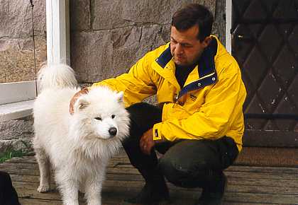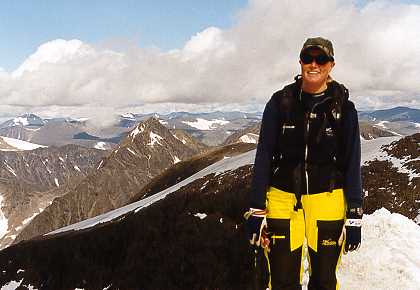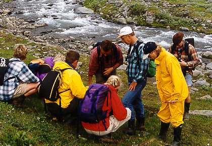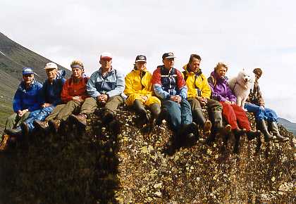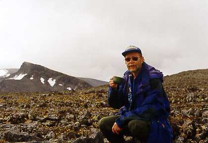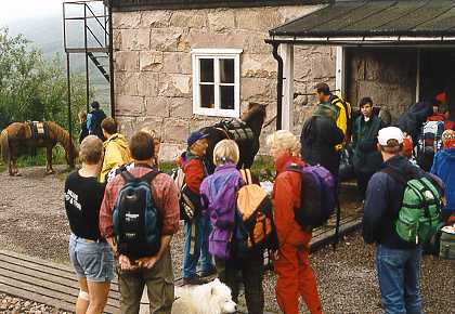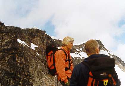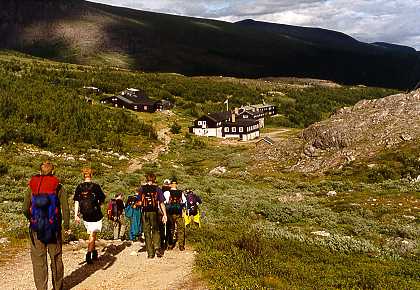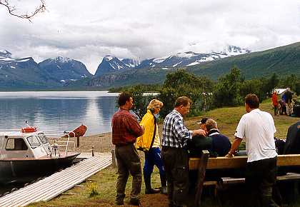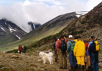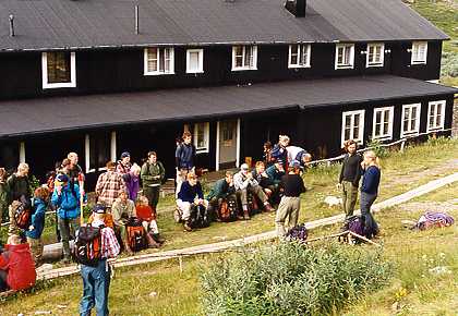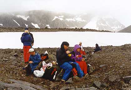 Dag 4: Tisdag 4/8 1998 kl. 13:00Nu sitter vi i en av forskningsstugorna i Tarfala och fikar, medan vi väntar på att få en föreläsning av föreståndaren här på stationen.Vi har fått möjlighet till detta genom att vi tillhör en STF-grupp med guide, som har ordnat detta. Annars måste man gå vidare till STF-stugan, som ligger 500 m längre bort. Vi startade vår i morse strax efter 9.00. Då hade redan första gruppen för toppbestigning varit iväg en halvtimme och den andra gruppen skulle också gå. |