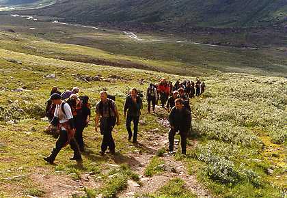 | Vi andra drog i väg strax efter 9.00. De båda gruppar, som skulle upp på Kebnekaise hade gått i väg tidigare. Vi gick västerut först och vid pilarna mot Singi, Västra- och Östra leden gick vi mot Västra leden. | Framme vid Kittelbäcken bar det av brant uppåt. Vi såg många andra, som också gick samma väg. De flesta tänkte gå Västra leden upp till toppen på Kebnekaise. Troligen skulle de inte klara detta, då det gick för långsamt och klockan började att närma sig 11.00. De flesta tycks inte inse hur långt och jobbigt det är. |