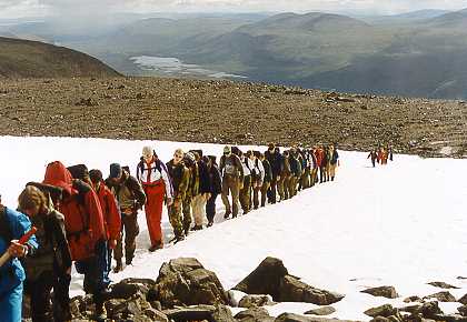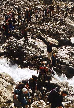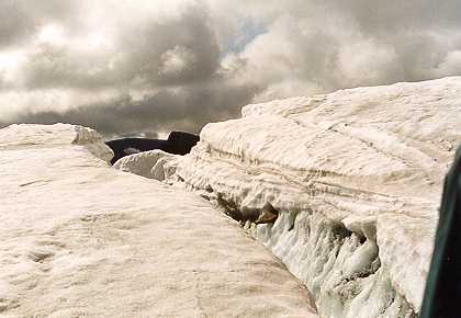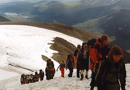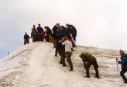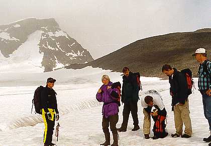 | Sedan alla blivit nöjda på utsikten och tagit tillräckligt med kort och ringt hem med bärbara telefoner gick vi tillbaka till toppstugan, där vi åt en extra lunch före nedfärd. Det hade tagit c:a 5 timmar att komma upp och nu var det dags att gå ned. | Nedfärden utefter berget var nog jobbigare för många, då det ofta kan vara värre att gå ned än upp. Vi fick åter bra hjälp av ledarna och efter en knapp halvtimme närmade vi oss övre delen av Björlings glaciär. |