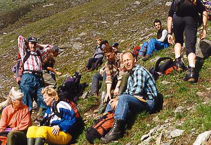 Dag 2: Söndag 2/8 1998 kl. 19:30Vi har just tillsammans avslutat vår middag och vilar nu ut i vårt rum.I dag har vi haft en skön och avslappnad dag trots att vi har gått upp mot 15 km. Vädret höll sig rätt bra på förmiddagen fast molnen hängde tungt över topparna. |