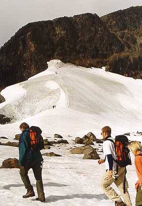 | Efter lunch hade dock vädret svängt. Det regnade inte längre och det lättade runt topparna. Vi kom så småningom in på Björlings glaciär. Den hade många sprickor och vi måste exakt följa ledarens fotspår och inte gå åt sidan för att fotografera. | Vädret blev nu allt bättre och man kunde se Nordtoppen. I slutet på glaciären blev det en mycket brant stigning av snöstigen upp mot berget. Där tog vi en paus för att samla modet inför en brant bergsklättring. |