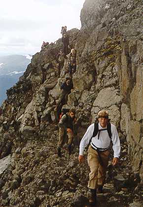 | Vid bergsklättringen gällde det att hålla rätt på fötterna och man fick inte ha anlag för svindel. Det fanns en del rep vid de svåraste passagerna och ibland gick det rakt upp. | En halvtimme senare kom vi upp över branten och kunde se gamla toppstugan. Vi såg även sydtoppen, där det var fullt med folk på toppen. |