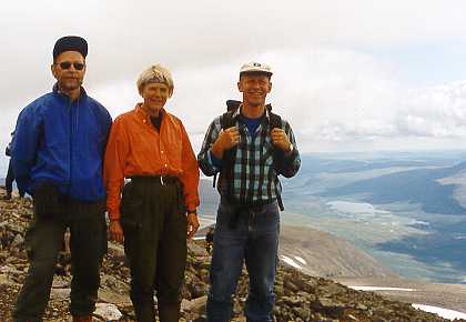 Tre nöjda toppbestigare. Dalgången Ladtjovagge med sjön Ladtjojaure syns till höger.