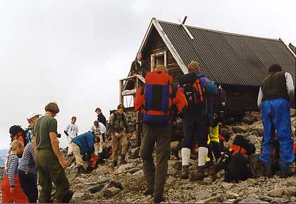 Vi samlas vid gamla toppstugan för en kort genomgång före bestigningen av sydtoppen.