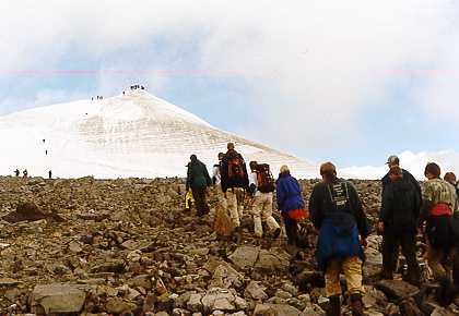 Först är det något brant och man ser inte toppen. Sedan planar det ut och toppen tornar upp bestående mest av is. Oftast är det snö på toppen, men nu var det mest is. |