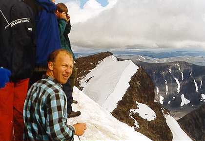 Däruppe på toppen var det en fantastisk utsikt åt alla håll och särskilt åt norr mot Abisko, där vädret var mycket fint. Då vi var så många, fick vi gå några stycken i taget upp mot toppen. |