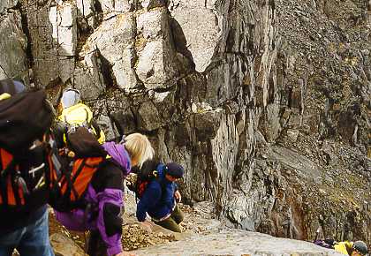Här börjar den besvärliga klättringen utefter klippan på berget.