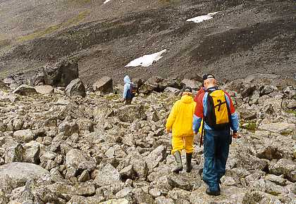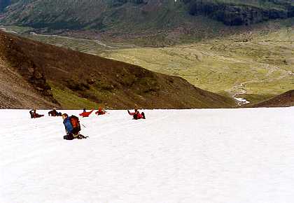 Vi gick en annan väg nu än då vi gick upp. Över glaciären var det mycket blött och sprickor, så de som hade låga kängor kanske blev blöta om fötterna. Sedan vi passerat ett fält med stenskravel kom vi fram till Kebnetjåkka glaciären. Vi skulle åka rutschkana utefter denna. Det gick ibland mycket fort och den blöta snön sprutade upp. |