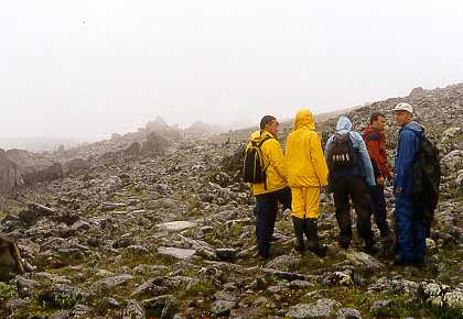 När vi gått en bit uppåt, började det att regna så vi tog på regnställ. Stigen blev blöt och stenig och gick ibland brant uppåt. Man märker vad mycket sämre vandringen blir då vädret är dåligt. Det är nog tveksamt om grupperna, som går mot Kebnekaise, kommer upp idag. Vi hade tur som valde att gå upp igår. Efter drygt 3 timmar var vi uppe här vid stugorna. Den sista biten upp var det väldigt stenigt och tät dimma, men nu har det blivit bättre. Kl 14.00 skall vi få vår föreläsning och sedan vänder vi om tillbaka. |