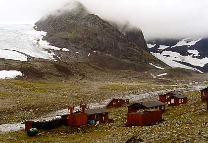 Dimman lättade något så att man kunde se stugorna och delar av glaciärerna.