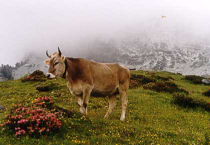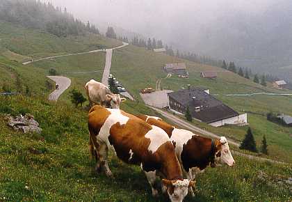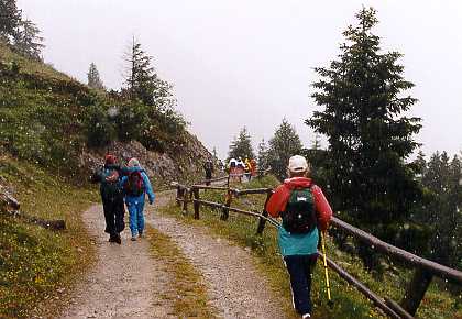 Under denna vandring började det att snöa men alla var på gott humör och det var riktigt vackert med en blandning av dimma, snö och dalgångar med gröna ängar och kor. Därifrån gick vi vidare utför en delvis smal och slipprig stig, som några äldre hade problem med, men sedan nere i Sonnalm (drygt 1400 möh) stannade vi och åt av den medhavda matsäcken. Klockan var strax över 11:00 på förmiddagen, så det var mycket kvar av dagen. |