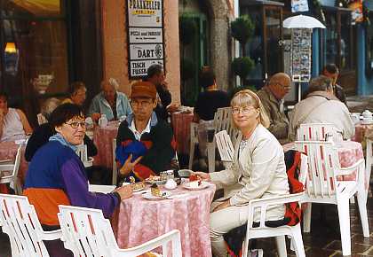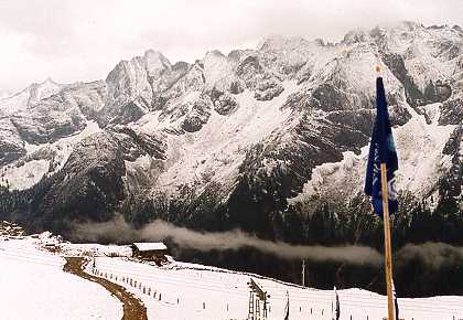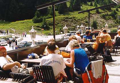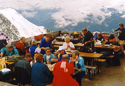 Dag 6: Torsdag 9/7 1998 kl. 21:30I dag blev det en riktig höjdardag trots egentligen dåligt väder. Efter frukost 07:30 handlade vi som vanligt vår lunch i närheten i en liten butik. Det blev lite bröd, juice, bananer, ost, chokladkaka och yoghurt.Vi har sedan tidigare handlat varma koppen, tepåsar och snabbkaffe. För min del har jag som drickbart med mig en flaska med vatten och en med juice 33 cl samt en liter hett vatten i en ståltermos. Man kan lämna in termosen på morgonen och få den fylld med hett vatten, men vi ordnar detta på rummet med en doppvärmare. |