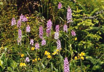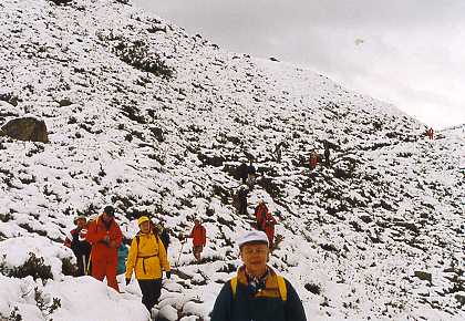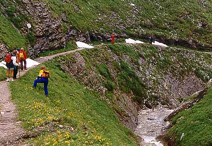 | Vi fortsatte utefter den branta stigen och kom så småningom ner under snöbältet och senare även till en blomsteräng. Himlen öppnade sig plötsligt och solen sken på topparna. Det var som i "Sound of Music". | Där åt vi en andra lunch. Sedan delades gruppen upp så att fyra st. skulle gå utefter en grusväg till en busshållplats för att ta bussen hem. Senare visade det sig att de gick hela vägen hem. |