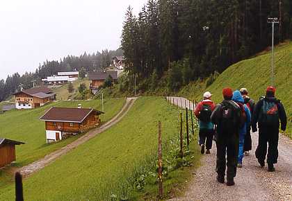 Det var uselt väder med lite blåst och regn samt mycket dimma. Efter 1.5 timmar på delvis liten och blöt stig, kom vi till Rastkogelhütte (2117 möh), som var en enkel restaurang. Man fick inte äta medhavd matsäck där inne, så de flesta beställde något som soppa och öl och några enstaka åt sin matsäck utanför. Efter en stund var vi några som gick en extra tur upp mot ett pass. Där blåste det väldigt hårt. Senare gick även några vidare upp mot en topp, medan vi andra gick tillbaka till restaurangen. 14:00 gick alla tillbaka ned mot Sportalm utefter en grusväg. Den gick i serpentiner neråt och det tog ordentligt på vadmusklerna. Ibland regnade det också en del. |